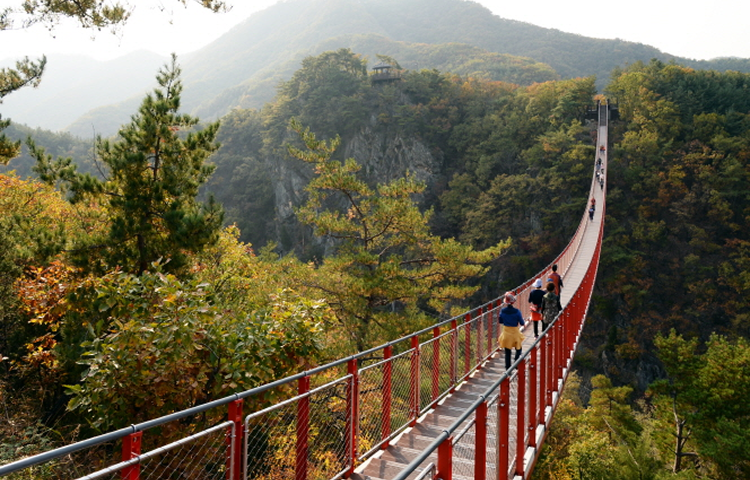감악산 출렁다리는 도로로 인해 잘려나간 설마리 골짜기를 연결하는 총 길이 150m의 무주탑 산악 현수교입니다. 맑은 하늘과 푸른 숲이 조화를 이루며 완만한 곡선을 그리는 출렁다리를 지나면 설마천을 품은 아름다운 운계폭포와 동양 최초의 백옥석 관음상을 간직한 범륜사도 위치해 있어 365일 내내 이용객들이 문전성시를 이루는 파주시의 대표적인 관광지입니다.